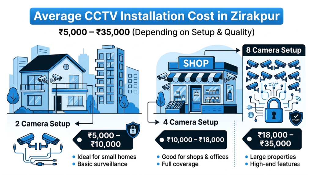 The cost of CCTV installation in Zirakpur typically ranges between ₹5,000 to ₹35,000, depending on the number of cameras, type of system, and installation complexity.