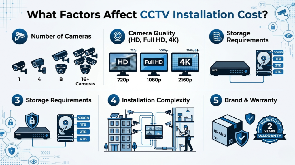Several factors influence the total CCTV installation charges.